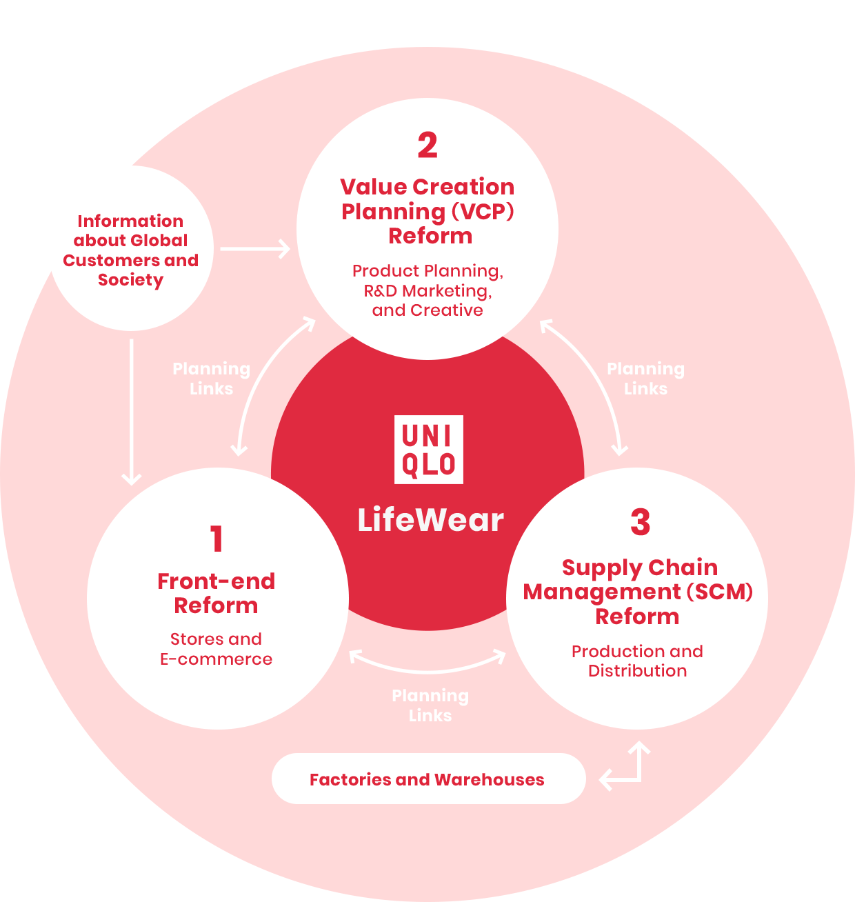 VCP is how we use the huge volumes of information collected from stores, e-commerce, and various other global information sources to create products. Our customers lead diverse lives in different parts of the globe. Their circumstances and opinions are always changing. We seek to sense those changes, listen carefully to their thoughts, and create the clothes that they really want to wear. We deliver LifeWear that offers more new value than customers imagined possible, and our marketing strives to convey the thinking and aim behind each product.