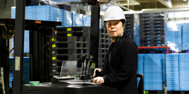 フォークリフトに乗り、商品や資材の搬出入を行います。