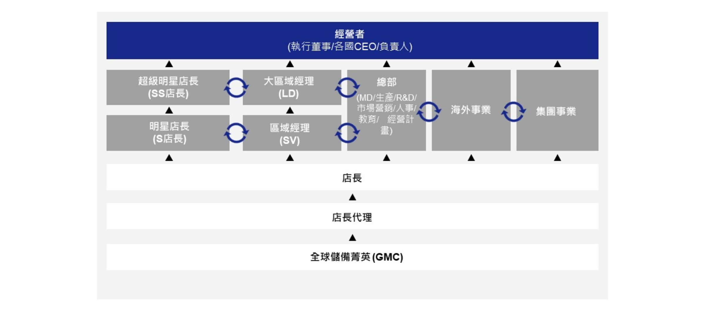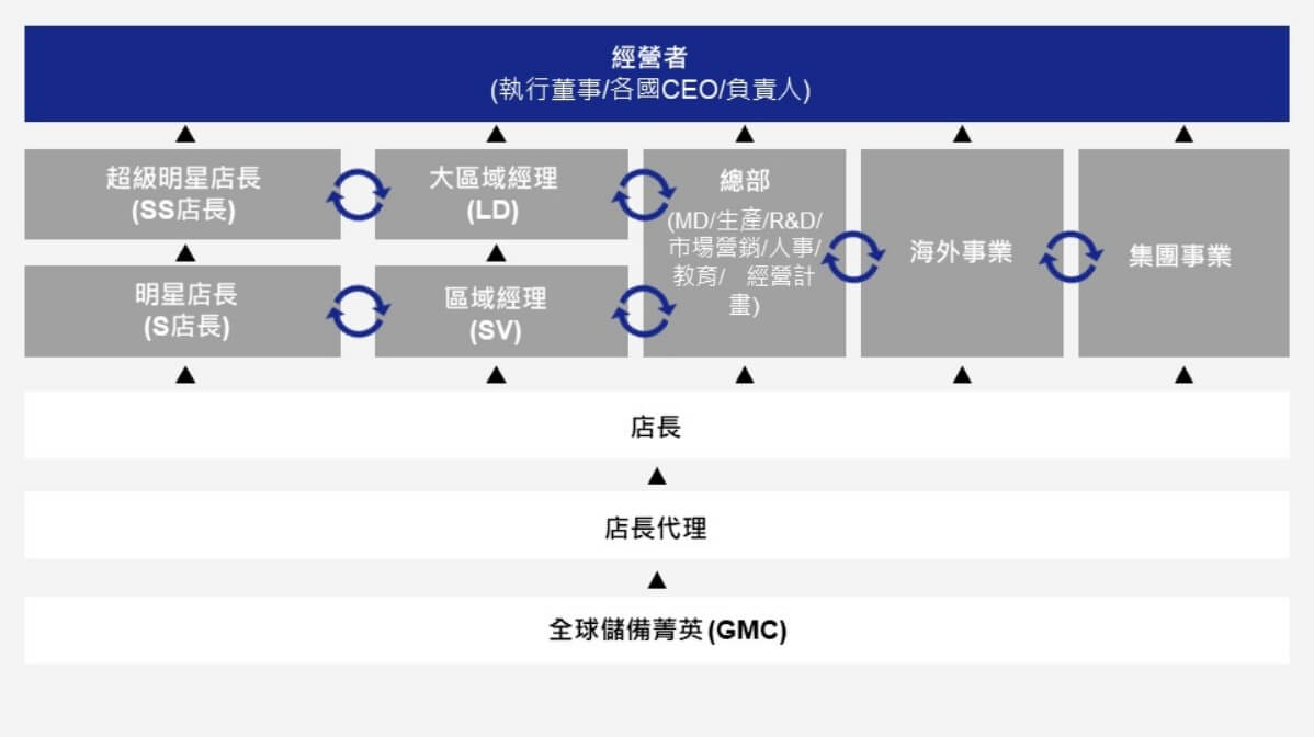 考量到各方面的期許與實力,成為店長後,也能以擁有更多決策權及收入的「SUPER STAR店長(SS店長)」、負責更多店舖及區域營運的「區域經理(SV)」或「大區經理(BLOCK LEADER)」、活用現場所學並成為店鋪強力支援的「總部人員」等角色持續活躍。能夠透過自己的志向與對自我的期許,創造多樣化的職涯。不論是在哪一個職位,都能抱持著將來成為「全球領導者」的極大可能,累積世界級的實力。