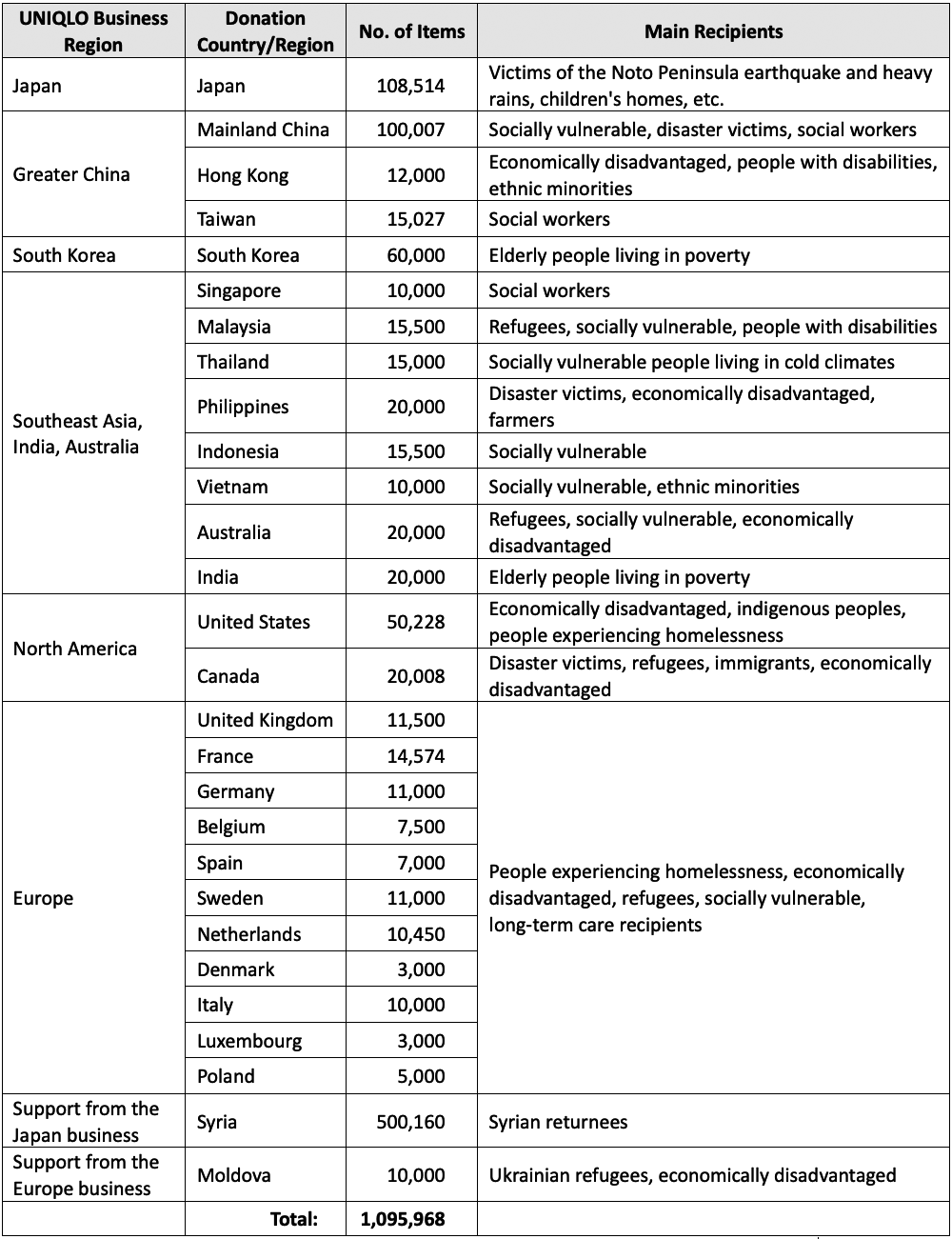 Global apparel retailer UNIQLO launched "The Heart of LifeWear" initiative in winter 2024, donating one million new items of HEATTECH thermal clothing to refugees, children, disaster victims, and other people in difficult situations around the world as a support measure to make their lives a little more comfortable. For 2025, UNIQLO made an additional donation of one million items.