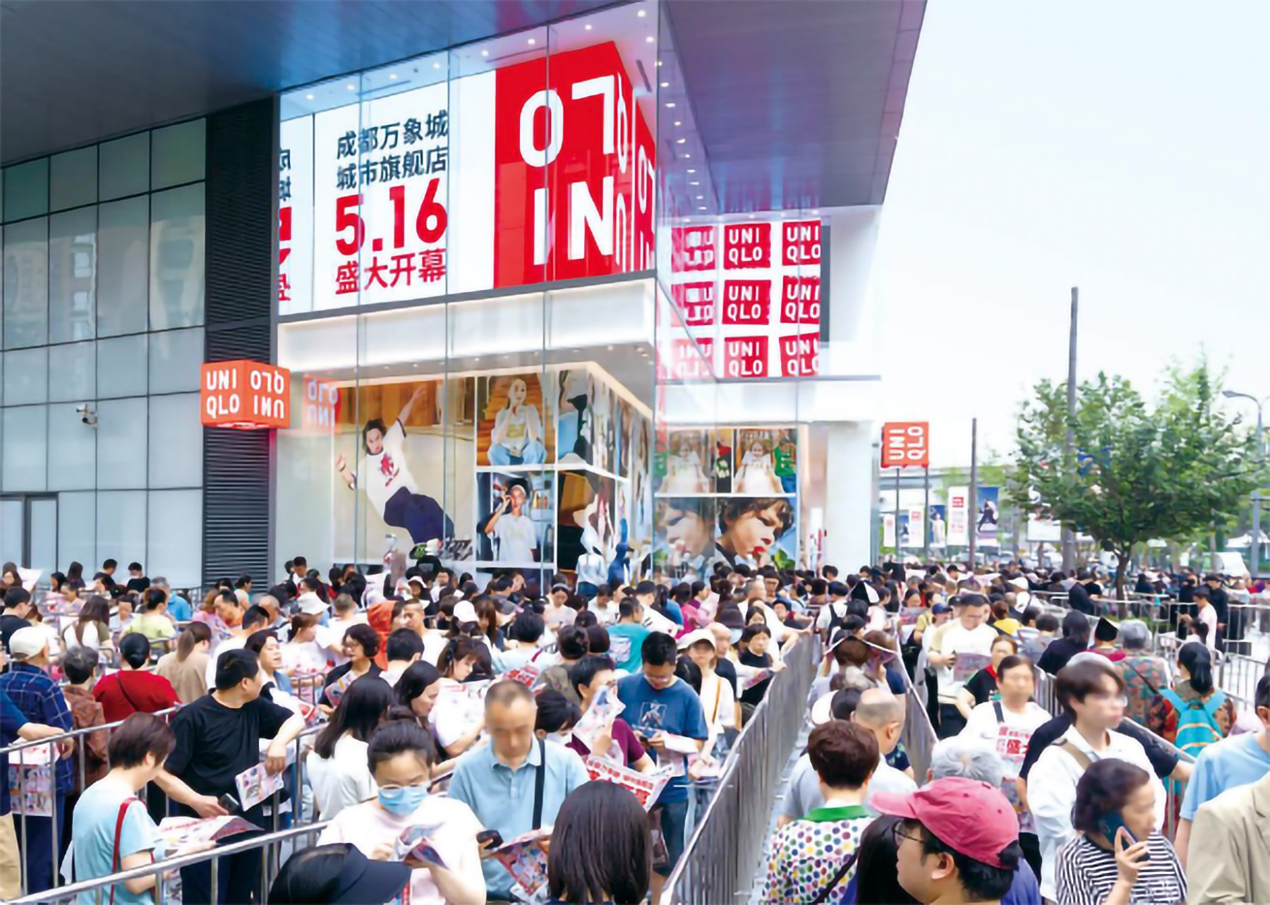 中国南西部初の旗艦店として、2025年5月に「ユニクロ 成都店」がオープン。開店前は、1,000名を超えるお客様が列をつくり、大盛況。パンダや四川料理などを描いた地元アーティストとのコラボによる限定のUTme!も好評。