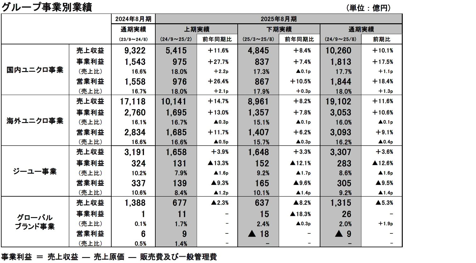 セグメント別では、国内ユニクロ事業は、若干の増収、事業利益は前年並みの見込みです。円安による調達コストの増加、人件費・物流費の上昇などコストが増加する局面ですが、お客様に支持いただける商品づくりやマーケティングの強化、適切な価格設定、生産性の改善、値引率の抑制、ローコスト経営により、15%以上の事業利益率を継続的に確保する見込みです。海外ユニクロ事業は大幅な増収増益の予想です。グレーターチャイナは増収増益、韓国、東南アジア・インド・豪州地区、北米、欧州は大幅な増収増益と、グローバルでの事業拡大が継続することを予想しています。北米は、ブランディングの強化、一部商品価格の見直し、値引率の改善、経費削減により、追加関税影響を吸収し、事業利益率約15%を見込んでいます。ジーユー事業は増収増益、グローバルブランド事業は増収、大幅な増益となる見込みです。