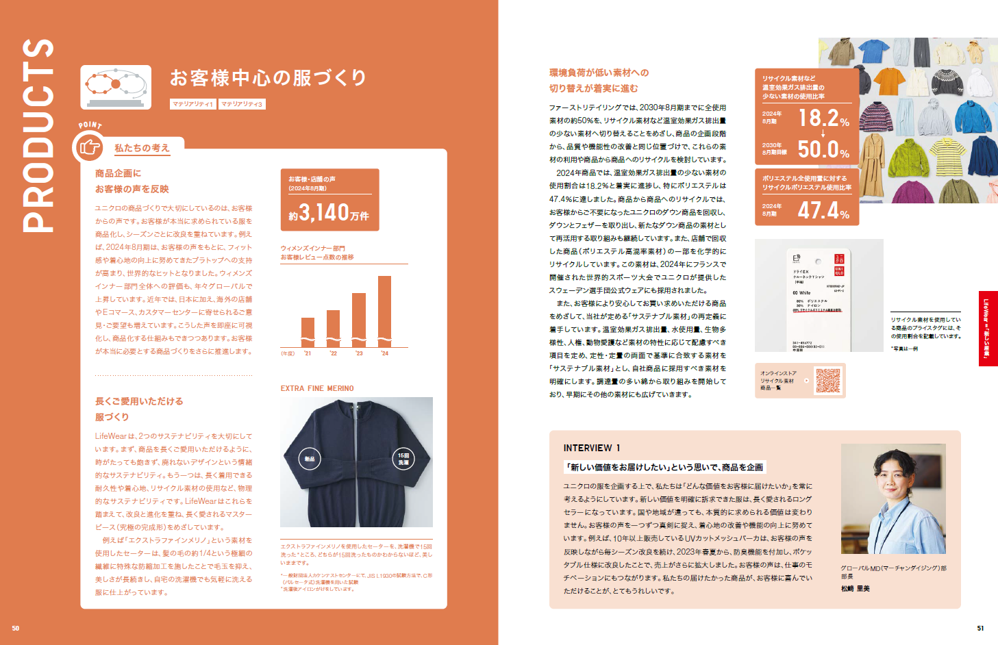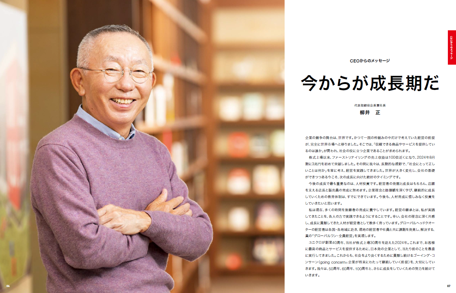 ファーストリテイリングの『統合報告書2024』は、主力のユニクロ事業のコンセプトであるLifeWear(究極の普段着)を通して、グローバルで支持される背景や今後の成長性をひもとくと同時に、私たちが事業と一体で推進している、サステナビリティ活動の考え方と取り組みについて説明しています。ビジュアルや図、イラストを駆使しながら、読者が素早く理解できるように編集することで、株主・投資家に限らず、取引先、従業員など、ファーストリテイリンググループに関わる、すべてのステークホルダーとの対話を深めるきっかけにしていただくことを目的としています。