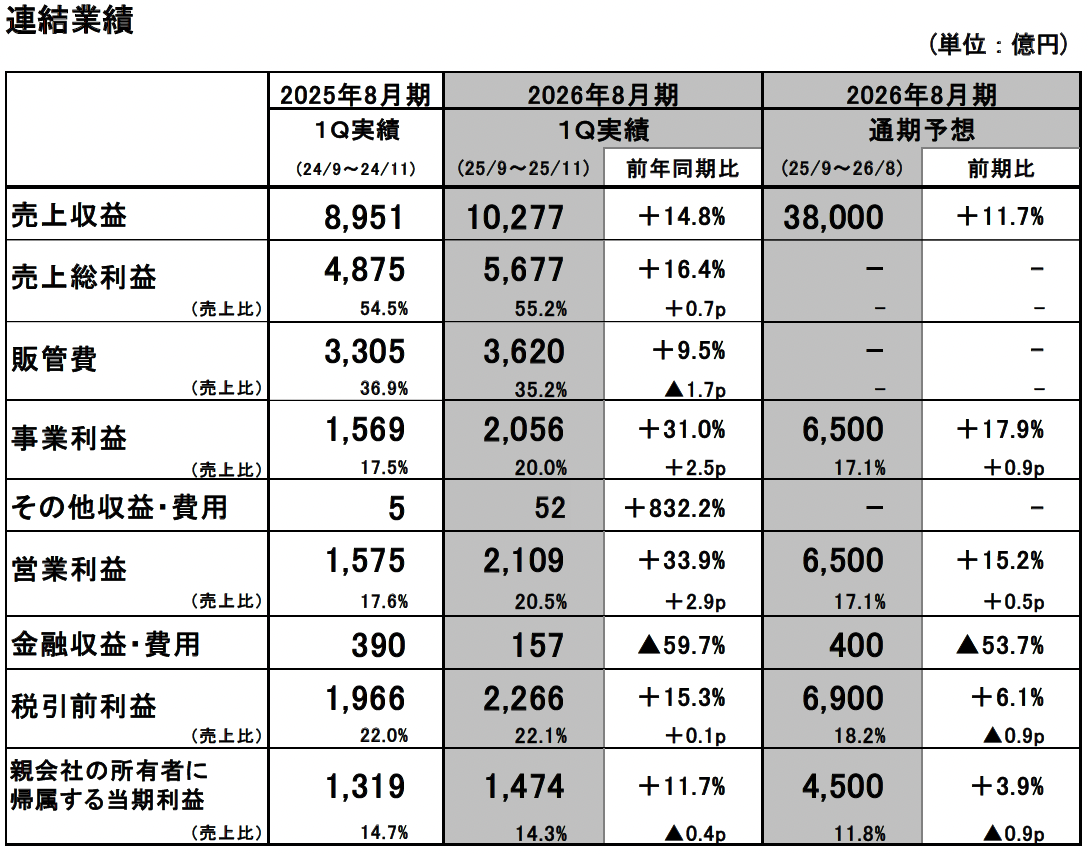 ■2026年8月期第1四半期の連結業績:大幅な増収増益、過去最高の業績